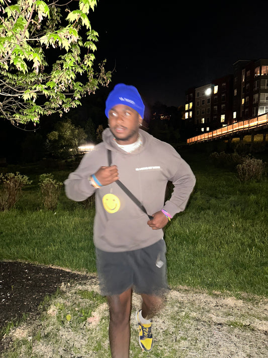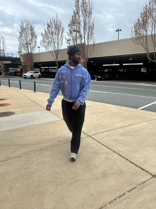 Stonewashed blue “Staunch Warehouse” graphic cropped hoodie
