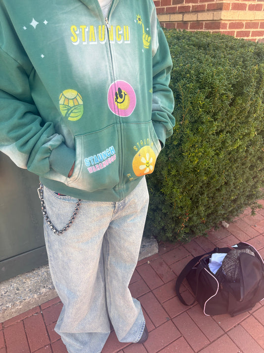 Acid washed Green “Staunch Warehouse” graphic cropped hoodie